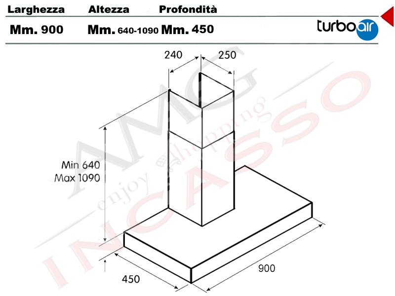 Cappa Turboair Sofia H6 IX/90 55915417 Cm.90 Inox Incasso cucina moderna Comando Push Button 3 velocità Motore 400 m³/h