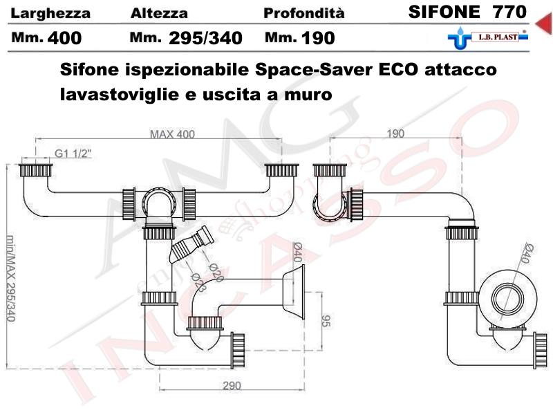 | Descrizione Prodotto | Sifone 2 via ispezionabile Space-sever L.B.PLAST 770 con attacco lavastoviglie e uscita a muro per lavabo lavello cucina incasso - ingresso 1 tubo scarico diam. 40 |