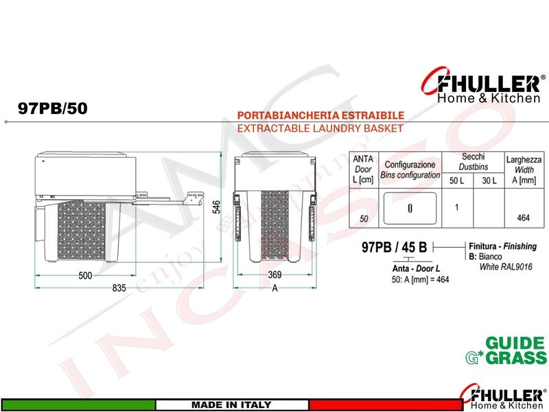 | Composizione | Cesto Portabiancheria ad Estrazione TOTALE Fissaggio Anta Base da 50 Guide Estrazione Totale GRASS NOVA PRO con 1 Cesto Secchio da 50 Litri Asportabili Completo di Coperchio, Chiusura Automatica Colore Bianco |